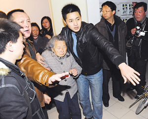 見對(duì)方?jīng)]有回應(yīng),男子開始要求徐家人把門關(guān)上。在對(duì)話中,防盜門被打開了,徐家人把防盜門關(guān)上之后,這名男子又說:“你們不要騙我,趕快把大門也關(guān)起來(lái),要不然我就要不客氣了!蹦凶右廊怀值秾(duì)著老太。