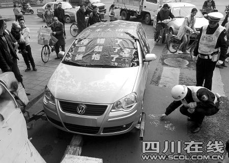 “停錯了!遭起了!被拖了!”14日上午,在成都太升南路兒童醫(yī)院旁,一輛亂停亂放的標(biāo)致307被交警罩上了一件特殊的“外衣”,“外衣”上醒目的幾行字,引起了不少市民駐足圍觀。面對如此“雷人”的外衣,市民褒貶不一。
