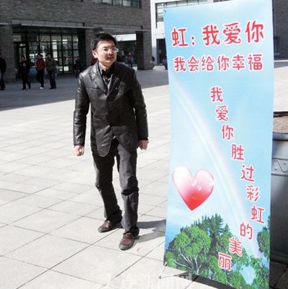 這捧愛的玫瑰是在昨日上午11時(shí)許出現(xiàn)在軟件園16號(hào)樓天井廣場(chǎng)內(nèi)的,一張一人多高的POP海報(bào)書寫著愛的誓言:“虹:我愛你,我會(huì)給你幸!、“我愛你勝過彩虹的美麗”。求愛的男青年站在海報(bào)旁,他說(shuō)希望他所愛的虹透過辦公室明亮的玻璃窗看到他的時(shí)候,能夠立刻來(lái)到他的面前,然而他等了半個(gè)小時(shí)也沒見到虹,而是樓上樓下、樓內(nèi)樓外數(shù)百雙好奇的眼睛。記者聽到了很多猜測(cè)的聲音,“這么長(zhǎng)時(shí)間沒出現(xiàn),說(shuō)不定人家已經(jīng)決定拒絕了。”“太興師動(dòng)眾了,全公司的人都看著,換作我還真有些不好意思出來(lái)呢。”“要是我的男朋友,我希望他坐著熱氣球來(lái)跟我求愛。”“讓我們慢慢等待,沒準(zhǔn)就會(huì)出現(xiàn)出其不意的浪漫!