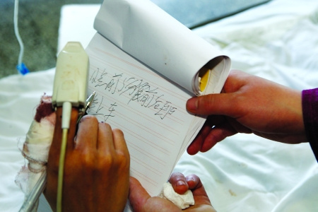 記者看到,25歲的蘇鑫臉色蒼白地躺在病床上,靠呼吸機(jī)呼吸。由于不能說(shuō)話,蘇鑫只能靠寫字與家人交流。放在病床邊的本子上,歪歪斜斜地記錄著蘇鑫出事的全過(guò)程!