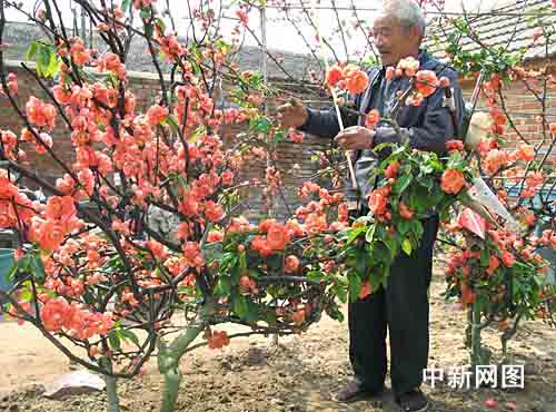 圖為花農(nóng)在給沂州海棠花人工授粉。 作者:夏洪雷