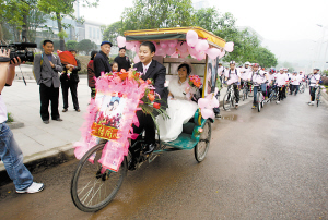 “在車隊(duì)組織的一次騎行中,我們成功戀愛了!薄鞍投埂闭f,自己與新娘因自行車結(jié)緣,所以辦一場自行車婚禮,是他一直的夢想,也想以這樣的特殊方式,送給同樣是80后的新娘一個(gè)“低碳”婚禮。