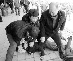 15分鐘后,黑夾克嘴角露出一絲微笑,好像看到了什么人,抬手打了個招呼,記者看到迎面走來的是一名女子。黑夾克剛要與女子說話,守候多時的3名民警猛然沖出,瞬間將黑夾克按倒在地。面對民警,黑夾克沒有進行任何反抗,也沒有說一句話。