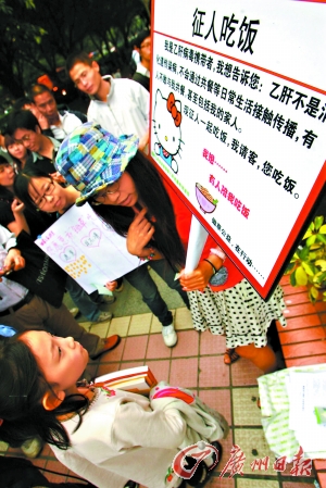 “我是乙肝病毒攜帶者,我想告訴您:乙肝不是消化道傳染病,不會通過共餐等日常生活接觸傳播,有人不敢與我共餐,甚至包括我的家人,F(xiàn)征人一起吃飯,我請客,您吃飯!弊蛉,廣州購書中心門前,一名女孩高舉著這樣一塊牌子要征人一起吃飯。女孩的網(wǎng)名叫鋤草,是一名留日海歸,跟網(wǎng)友成立了“鋤草”科普組織,專門進(jìn)行乙肝科普活動。