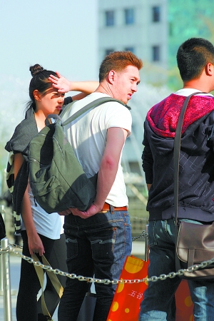 昨天中午,等候出租車的游客用手遮擋熱辣的陽光。席賀興攝(圖片來源:北京日?qǐng)?bào))