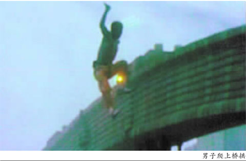 昨日下午3點(diǎn),一輛奔奔車停在彩虹橋上,一名身穿粉紅色短袖、黃色長(zhǎng)褲和白色皮鞋的中年男子走出車,一手拿著一瓶裝滿汽油的塑料瓶,一手握著一把匕首,徑直朝橋中央的橋拱爬去,嘴里一直嘟囔著。路人發(fā)現(xiàn)后,紛紛對(duì)男子大喊“快下來(lái)”。但他仍往上爬,最后坐在4米高的橋拱頂,把上衣脫了扔下來(lái),并不停用匕首朝汽油瓶口反復(fù)刺著,還搖晃著身體,隨時(shí)有可能會(huì)掉下來(lái)。