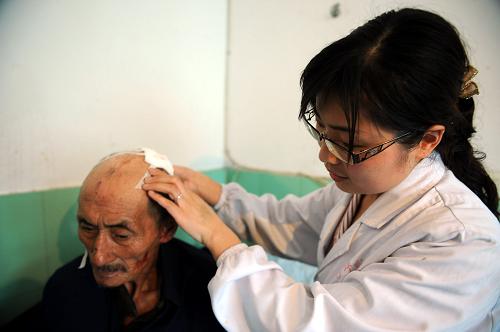 5月6日,重慶墊江縣沙坪鎮(zhèn)衛(wèi)生院醫(yī)生在為傷員進行包扎。從5月5日夜間開始,重慶各地出現(xiàn)了一次明顯的降溫降雨伴隨局地強風雹和暴雨天氣過程。截至6日15時45分,發(fā)生在墊江、梁平、涪陵等地的強風雹和暴雨災(zāi)害的死亡人數(shù)增至29人,受傷190人。目前全部傷員均被安置在多家醫(yī)院接受救治。新華社記者周衡義攝