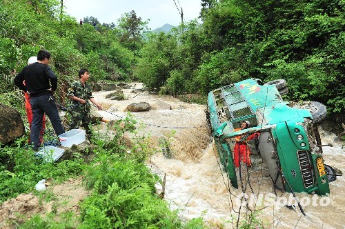 湖南省婁底市雙峰縣沙塘鄉(xiāng)白河村地段,一中巴車翻入山澗,造成1人死亡,一人失蹤,6人受傷。中新社發(fā) 郭國權 攝
