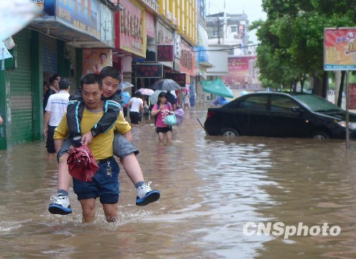 受強降雨影響,湖南新化縣城區(qū)寬闊的街道已經(jīng)變成了洶涌的河面,很多市民為了趕著上班、上學,冒險涉水通過。中新社發(fā) 肖前輝 攝