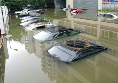 今晨,經(jīng)過一夜暴雨后,廣州白云區(qū)黃石路一處停車場,多輛車輛遭遇“沒頂之災”。鄭迅攝(圖片來源: 羊城晚報)