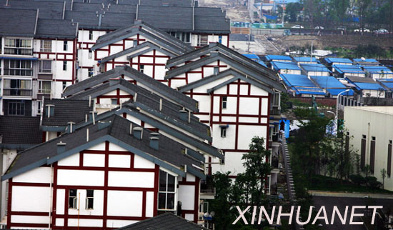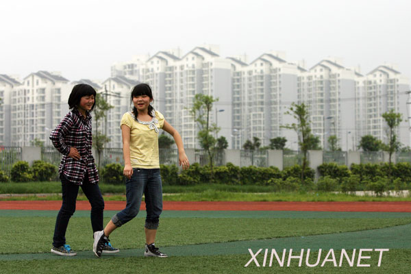 5月7日,兩名女中學(xué)生在學(xué)校操場上漫步,她們身后是新建成的安居住房!5·12”特大地震使四川省都江堰市城鎮(zhèn)住房嚴(yán)重受損,共有10.89萬個(gè)家庭、30余萬人的住房不同程度地遭到破壞。曾經(jīng)物華天寶、山清水秀的小城,在短短的80秒地震后,變成了滿目瘡痍、傷痕累累的極重災(zāi)區(qū)。新華社記者鄭悅攝