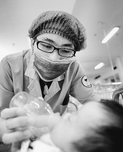 圖為湖南兒童醫(yī)院新生兒一科男護士在護理病房給寶寶喂奶(5月10日攝)。新華社記者 龍弘濤攝