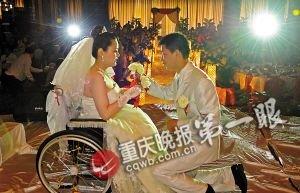 昨(16日)中午,重慶渝北區(qū)天宇大酒店,高大英俊的新郎,邁著篤定的步伐走近新娘。他跪在坐著輪椅的新娘面前,許諾照顧她一生。