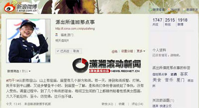 “派出所”微博的用戶注冊(cè)信息為福建廈門,介紹自己“明天值班”。他還給自己貼了“美食、音樂、老酒、客家”等標(biāo)簽。自2009年10月30日開通,至今共發(fā)出1918條微博。