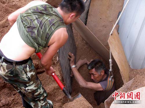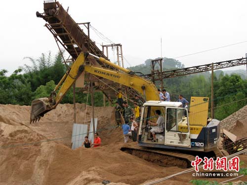 10時(shí)30分,一臺(tái)大型挖掘機(jī)緊急開(kāi)赴營(yíng)救現(xiàn)場(chǎng)。并迅速將坑底外圍的河沙清理掉,慢慢挺進(jìn)中心位置。由于挖掘機(jī)工作時(shí)振動(dòng)較大,不時(shí)有松散的河沙從高處流向坑底,對(duì)營(yíng)救工作造成極大困難。坑底營(yíng)救隊(duì)員在外圍人員的協(xié)助下,用護(hù)沙物不斷加大被困人員的保護(hù)范圍,并與被困人員進(jìn)行交流,消除被困人員的焦慮、恐慌心理。