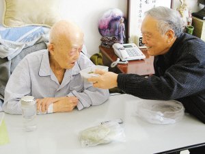 2008年11月7日,季羨林先生的兒子季承到北京301醫(yī)院探望季老,帶來父親最喜歡吃的山東“卷糊餅”和山東人過年吃的“十香菜”。 (資料圖片)