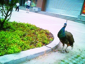 也許是周?chē)蘼返木壒,位于基隆街上的“美知美味”飯店生意并不火,服?wù)員閑著沒(méi)事坐在門(mén)口,遠(yuǎn)遠(yuǎn)看見(jiàn)有人光顧,便起身迎接。還沒(méi)進(jìn)入飯店,外面綠化帶旁有只孔雀引起了記者注意?兹副凰┰谝豢脴(shù)上,不時(shí)抖動(dòng)幾下羽毛,這種平時(shí)在動(dòng)物園里才能見(jiàn)到的美麗動(dòng)物,也許已經(jīng)知道自己不久會(huì)被哪位財(cái)大氣粗的顧客買(mǎi)下,成為盤(pán)中之物,所以顯得可憐巴巴的。