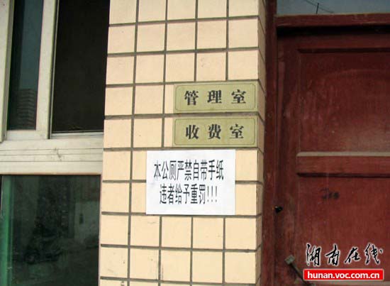 據(jù)了解,此公廁位于武漢市武昌區(qū)某建材市場內(nèi)。張先生說,他是中午去建材市場幫單位買點(diǎn)東西,無意間發(fā)現(xiàn)了這條“雷人”的標(biāo)語警告,于是拍了照。在這個公廁上廁所每人每次五角,手紙另外收費(fèi)三角。