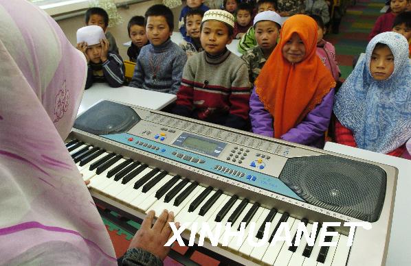 資料圖片:2007年11月19日,穆斯林孤兒院的老師正在給孩子們上音樂課。寧夏回族自治區(qū)首家穆斯林孤兒院在銀川開園。該孤兒院由寧夏穆斯林福利協(xié)會與科威特亞洲穆斯林委員會合作修建,建筑面積2100平方米,可容納300名孩子。新華社記者 王鵬 攝