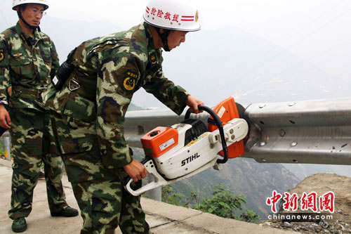 搶救人員正對(duì)排險(xiǎn)處的鐵護(hù)欄進(jìn)行切割處理。作 者:汶川縣新聞中心供