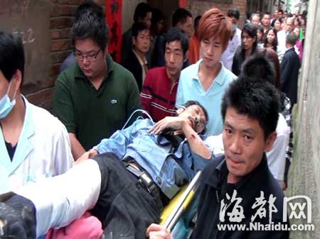 附近居民趕來(lái)幫忙,和醫(yī)護(hù)人員一起把老楊抬上救護(hù)車。(圖片來(lái)源:東南新聞網(wǎng))