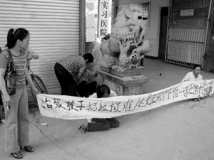 家屬在醫(yī)院門口拉橫幅討要說法。(圖片來源:云南網(wǎng))