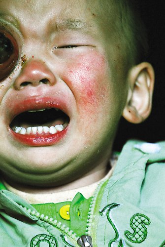 在家里,每次媽媽抱著小錦,一看到他腫大而突出的右眼,淚水就會不停往外涌?吹綃寢寕某槠鼤r,小錦便會緊緊摟住媽媽的脖子,用胖乎乎的小手在媽媽的后背來回撫摸,他還不會說話,卻會用自己的方式安慰媽媽。