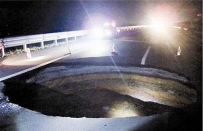 前天凌晨零點25分,類似一幕發(fā)生在浙江黃衢南高速公路江山段:高速公路路面忽然塌下形成一個直徑8.3米深6米的大洞。幸虧當時來往車輛及時避開洞口,避免了人員傷亡事故的發(fā)生。