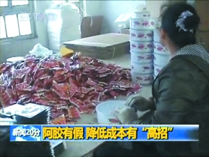 據(jù)央視《每周質(zhì)量報告》報道 阿膠是一種滋補品,主要由整張驢皮熬制而成,因原產(chǎn)山東東阿縣而得名。在山東東阿縣有很多阿膠制品企業(yè),記者調(diào)查時發(fā)現(xiàn),當?shù)氐陌⒛z制品生產(chǎn)企業(yè),所用的原料很多是摻有牛皮、馬皮的劣質(zhì)阿膠。河北無極縣永豐藥業(yè)一國藥準字號阿膠是使用劣質(zhì)皮料熬制而成。