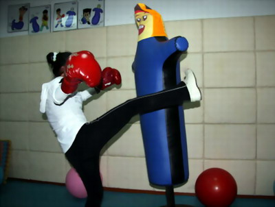 資料圖片:一名學(xué)生在“宣泄室”擊打橡膠人