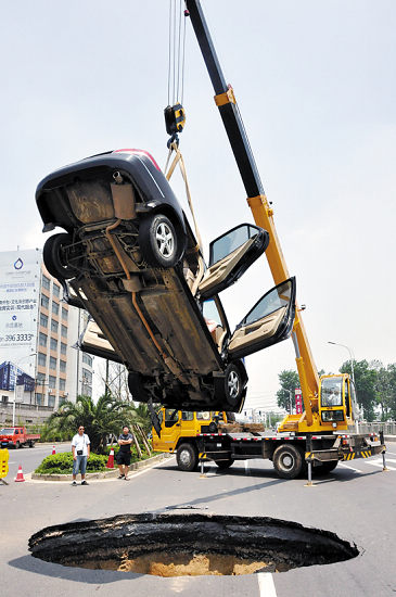 上周五,陷入南昌街頭塌陷路面上的小轎車被吊離現(xiàn)場(chǎng) 新華社 發(fā)