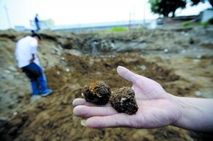 圖為記者在工地現(xiàn)場發(fā)現(xiàn)的兩枚鐵疙瘩。晨報記者 郝笑天/攝