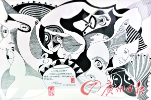 窗外,陽光明媚,綠草如茵,但阿剛很少抬頭往外看。在廣州市民政局精神病院職業(yè)治療部的繪畫室,49歲的阿剛有一張專屬于自己的畫桌。他常常紋絲不動(dòng)地坐在桌前,低頭凝視畫紙,慢慢用鋼筆在上面畫畫。他在畫什么?大家不知道,但可以肯定的是,他絕對(duì)不是在隨意亂畫。大家認(rèn)為那是抽象畫,但阿剛自稱是“理象派”。