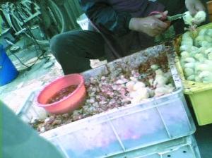 在其中一個加工攤點,一名女子拿著剪刀,正在完成第一道工序,將雛雞的雙腿和頭剪掉。