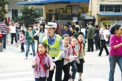 每天上學(xué)和放學(xué)的時候,瀘州市江陽區(qū)西路學(xué)校門前就會出現(xiàn)一個女交警,護送孩子們通過門前的街道。