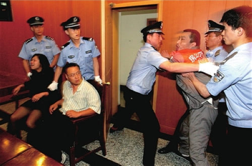 肇事司機張文明在法庭上情緒激動,他的妻子和大舅哥也分別被控制。本報通訊員李倩攝