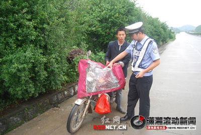 高速交警駕車巡邏至離良田收費站2公里處(1809公里),發(fā)現(xiàn)一男子身披雨衣,正晃晃悠悠地騎著一輛摩托車沿路肩朝廣州方向駛?cè)ァ?/P>
