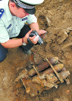 很快,民警在現(xiàn)場(chǎng)拉起警戒線,挖出來(lái)的大鐵箱子銹跡斑斑,里面裝有6枚炮彈。隨后,專業(yè)人員對(duì)挖掘出來(lái)的炮彈和手雷進(jìn)行了排險(xiǎn)操作。當(dāng)天,工人們又在現(xiàn)場(chǎng)挖出了二三十個(gè)手雷。據(jù)了解,這些爆炸物品均屬解放前遺留。