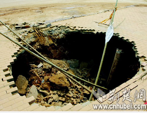 在黃陂區(qū)盤龍城佳海工業(yè)園,突然出現(xiàn)一個直徑約4米、深約5米的大坑,險些將一名過路轎車吞噬。