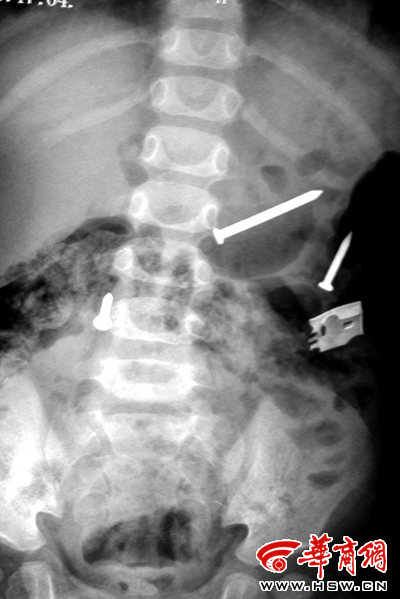 來(lái)自榆林市米脂縣的這名一歲半女孩,在最近一個(gè)多月內(nèi),從體內(nèi)不斷排出鐵釘,共達(dá)20多枚。更為奇怪的是,在醫(yī)院拍片顯示體內(nèi)已沒(méi)有鐵釘時(shí),過(guò)幾天鐵釘還會(huì)出現(xiàn)。