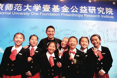 李連杰與孩子們在簽名板前合影留念。本報記者王磊攝