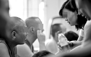 江北區(qū)強(qiáng)制戒毒所,曾經(jīng)是大學(xué)老師的張文(左)與前來(lái)探望自己的女友交談 本報(bào)記者 李文彬 攝