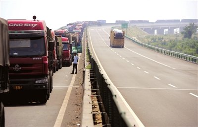 滯留的進京大貨車排起長隊,與對面出京車道形成鮮明對比。