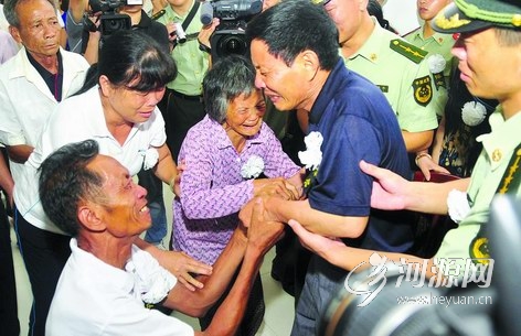 被葛曉威解救的群眾劉運娣老人和她的家人向烈士家屬下跪志哀 本報記者 馮曉銘 攝