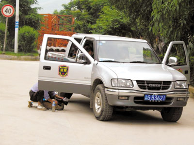 附有相關(guān)照片的帖子最先于6月4日發(fā)表在墊江論壇上。照片清晰地顯示,車門上印有“市政監(jiān)察”字樣的一輛皮卡停在路邊,一人斜躺在駕駛員座位,伸出一條腿到車外,一名男子坐在小矮凳上深俯著腰在為其擦鞋,頭在車內(nèi)男子的膝下。另一張照片顯示,副駕駛室座位上也另有一名男子伸下腳擦鞋。