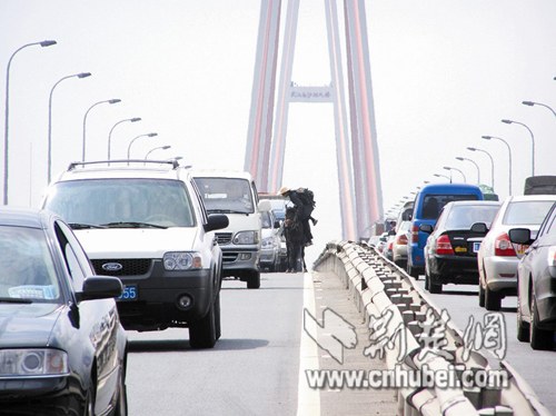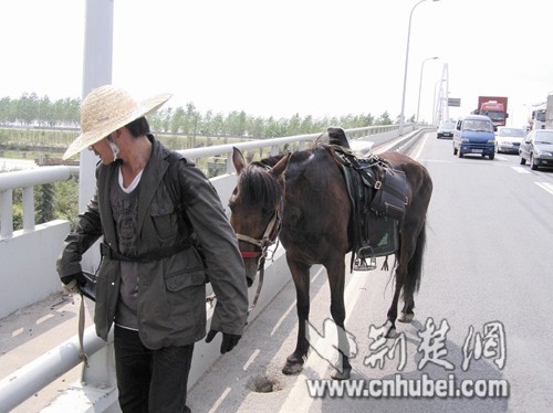 頭頂草帽、肩挎背包,一身厚厚的休閑服,跨下威武的棗紅馬。昨日下午,武漢三環(huán)線長江三橋橋面出現(xiàn)的這名騎士令過往車輛驚愕讓路,交警緊急趕到極力勸阻后將游俠護送離開城市快速路面。