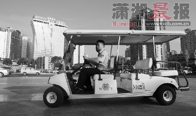 賀龍?bào)w育館附近,大學(xué)生協(xié)管員沈溪濱和同事開(kāi)著巡邏車(chē)在轄區(qū)內(nèi)巡邏。記者秦樓