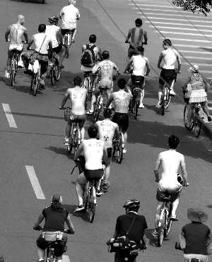著泳褲、泳裝,身上畫著五彩花紋,騎著自行車,昨天(4日)下午,約有20位網(wǎng)友如此裝扮出現(xiàn)在北京的街頭。據(jù)活動的組織者介紹,該活動意圖在于倡導(dǎo)讓人們選擇方便、環(huán)保的自行車出行,“裸露”的人體則是提醒司機要注意騎車人的安全。