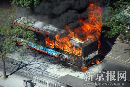 7月6日上午8時30分許,華威橋南50米處,一輛公交車突發(fā)大火。 讀者趙先生攝 圖片來源:新京報網(wǎng)