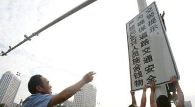 昨日,石市交管局設(shè)施大隊(duì)在建設(shè)大街裕華路口安裝了四塊“嚴(yán)禁施舍”警示牌。設(shè)施大隊(duì)彭連升表示,乞討人員嚴(yán)重干擾了交通安全,交警曾將一些乞討人員送到救助站,但乞討人員并不愿意留在那里。無(wú)奈之下,交警掛出警示牌提醒司機(jī)注意安全。